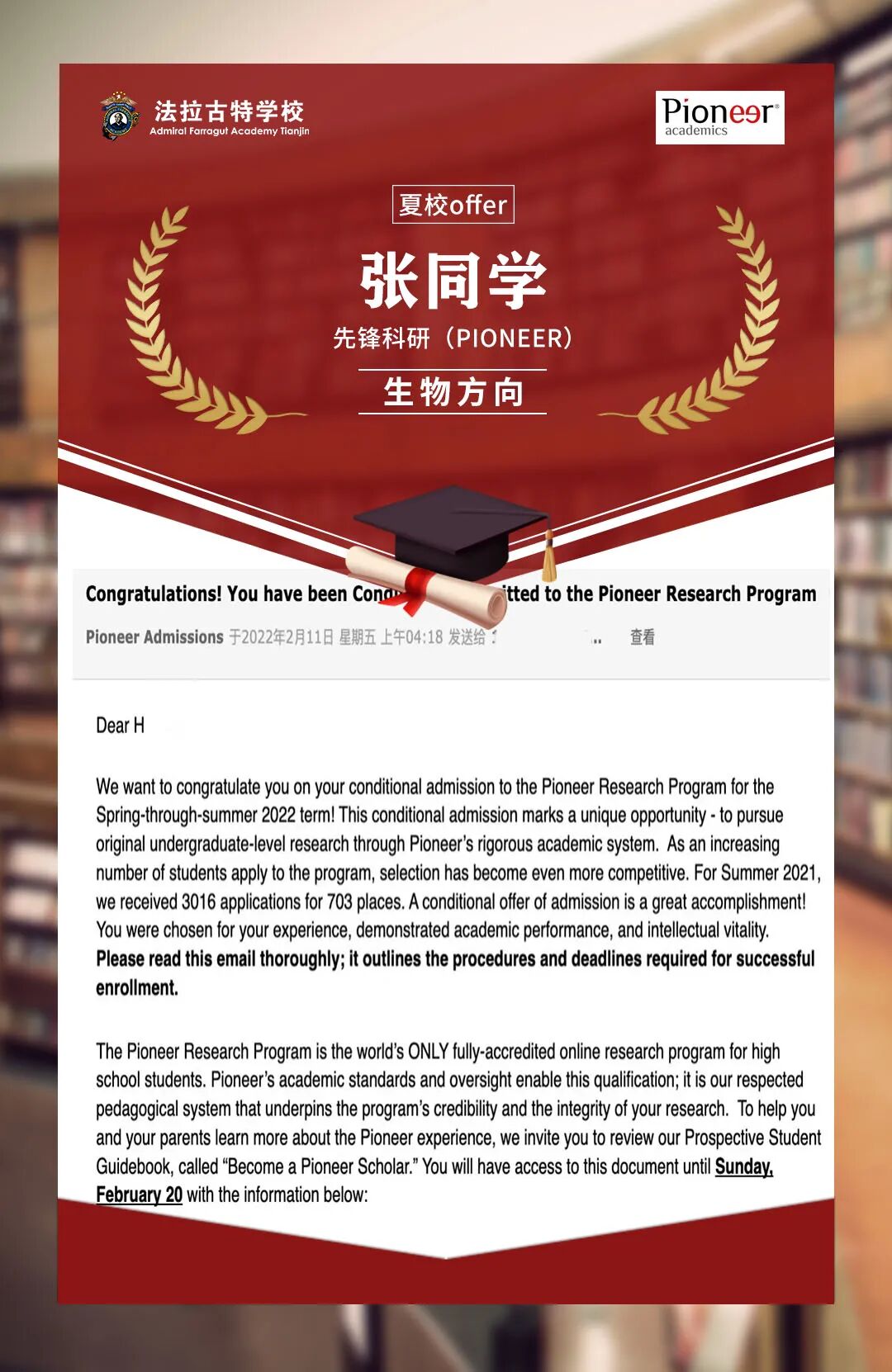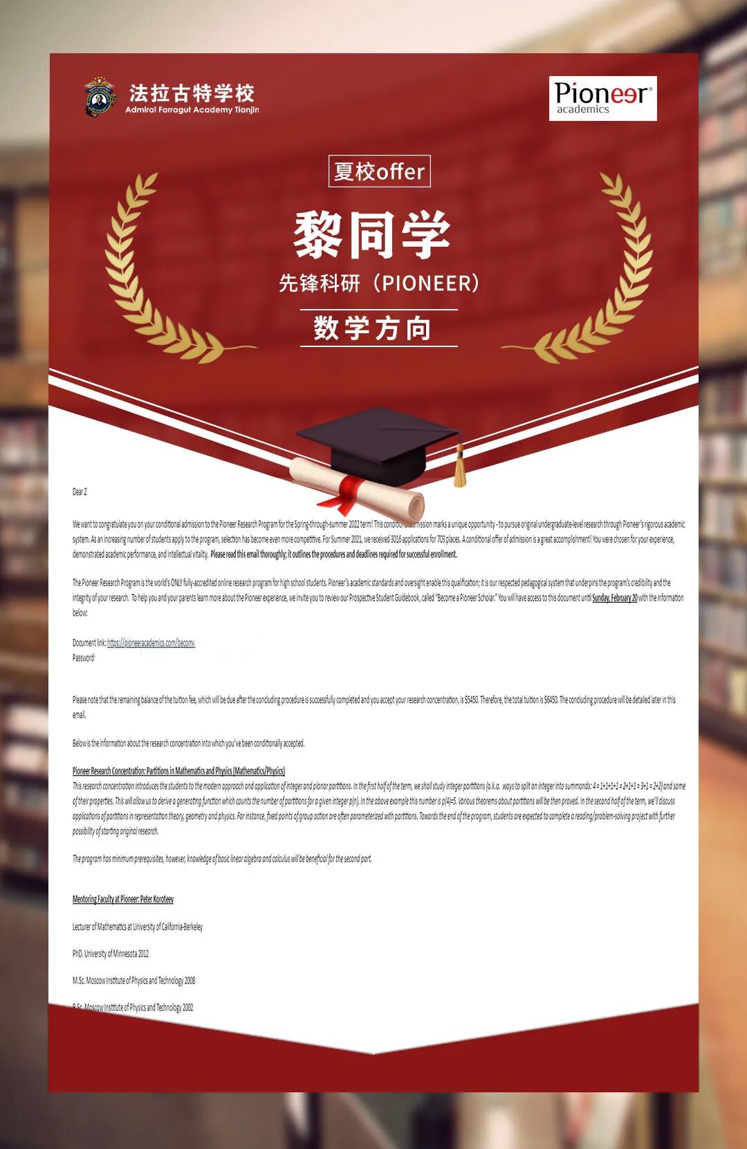 张同学和黎同学分别收到先锋科研项目:Pioneer academics生物方向和数学方向录取通知书。