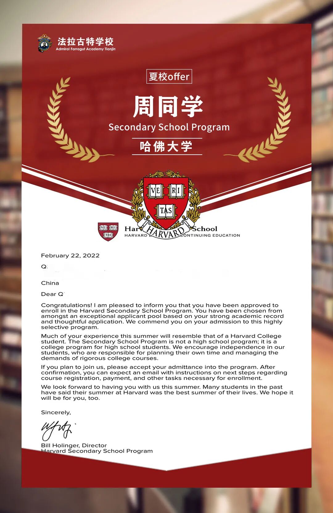 和1封哈佛大学暑期学分夏校Havard Secondary School Program录取信!