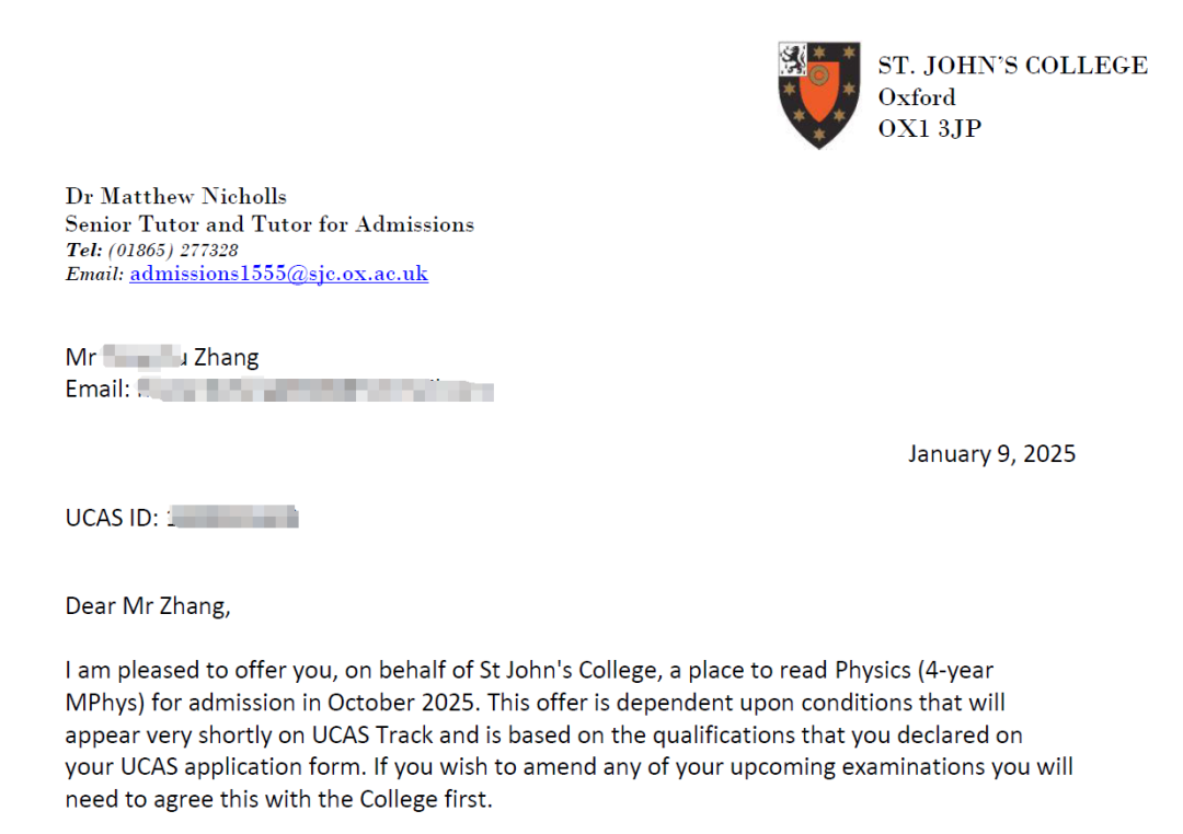 In the admissions season for the Class of 2025, we warmly congratulate Howard Zhang from Tianjin Farragut School, who has been offered a place at the University of Oxford to study Physics, ranked No. 3 in the QS World University Rankings for 2025!